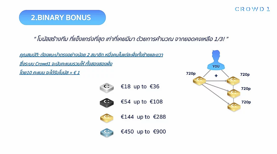 – คำนวณจาก คะแนน ไบนารี ซ้าย + ขวา และได้รับโบนัสมากน้อยขึ้นอยู่กับตำแหน่งทางธุรกิจใน CROWD1 โดยตำแหน่งแรก เริ่มที่ 500 POINT